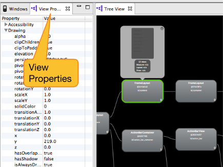 View. - Tree Overview (Présentation de l'arborescence) en haut à droite : vue d'ensemble de la hiérarchie complète des vues de votre application. Déplacez le rectangle gris pour modifier la fenêtre d'affichage visible dans l'arborescence (Tree View).