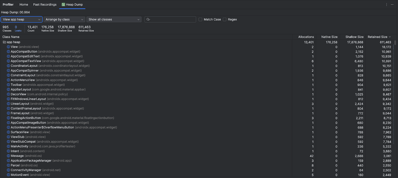 Para filtrar rápidamente las clases que podrían estar asociadas con fugas de memoria, abre en el menú desplegable de la clase y selecciona Show activity/fragment revenue. Android Studio muestra las clases que considera que indican fugas de memoria Activity y Fragment instancias en tu app. Los tipos El filtro muestra los siguientes datos:
