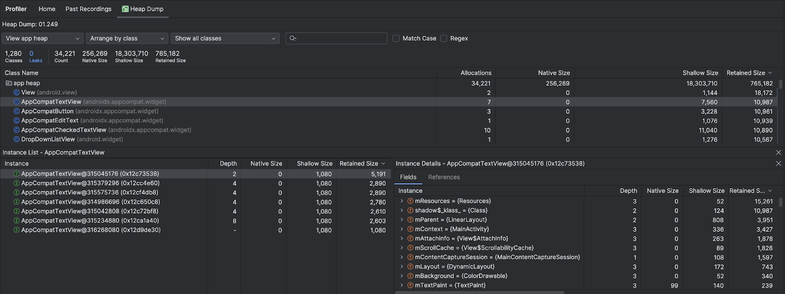潜在的なメモリリークを見つけるには、[フィールド] タブと [参照] タブを使用します。 [Instance Details] で、対象のインスタンスまたはソースコードの行に移動します。