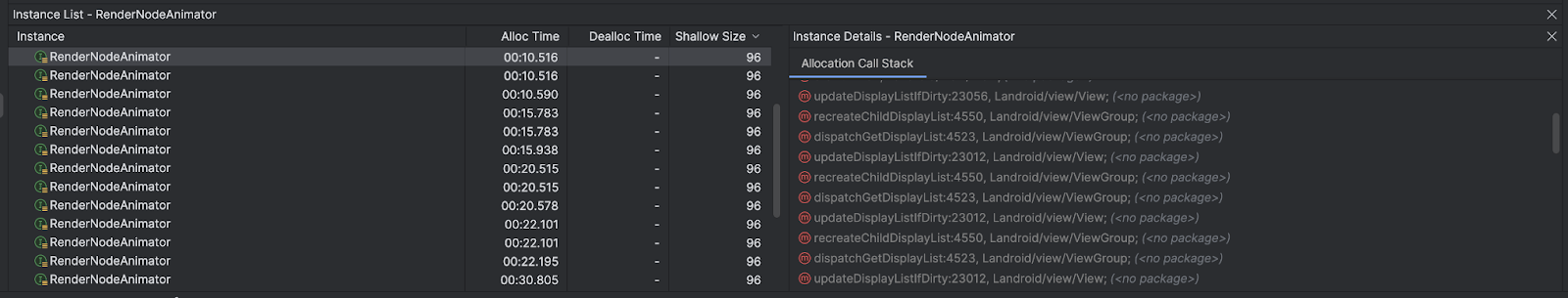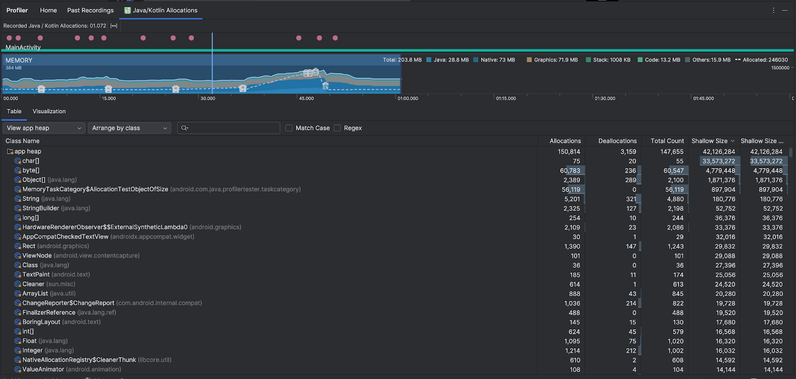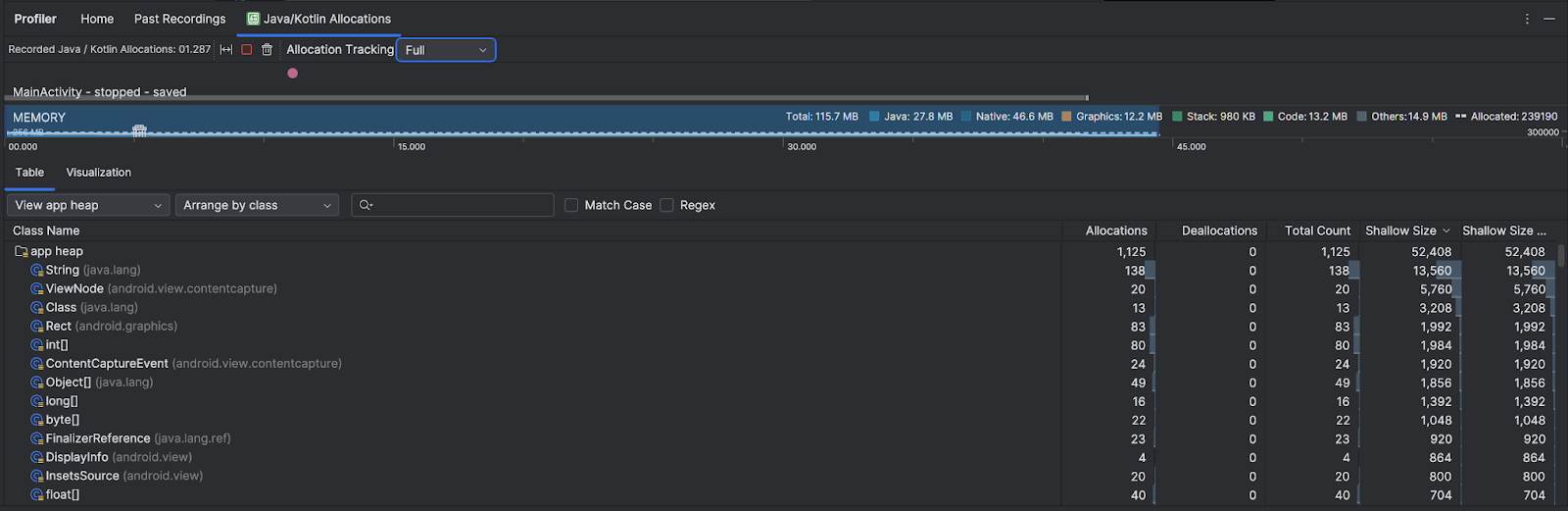 يساعدك تسجيل عمليات تخصيص Java/Kotlin في تحديد أنماط الذاكرة غير المرغوب فيها التي قد تتسبّب في حدوث مشاكل في الأداء. يمكن أن يعرض لك أداة تحليل الأداء ما يلي حول عمليات تخصيص الكائنات: