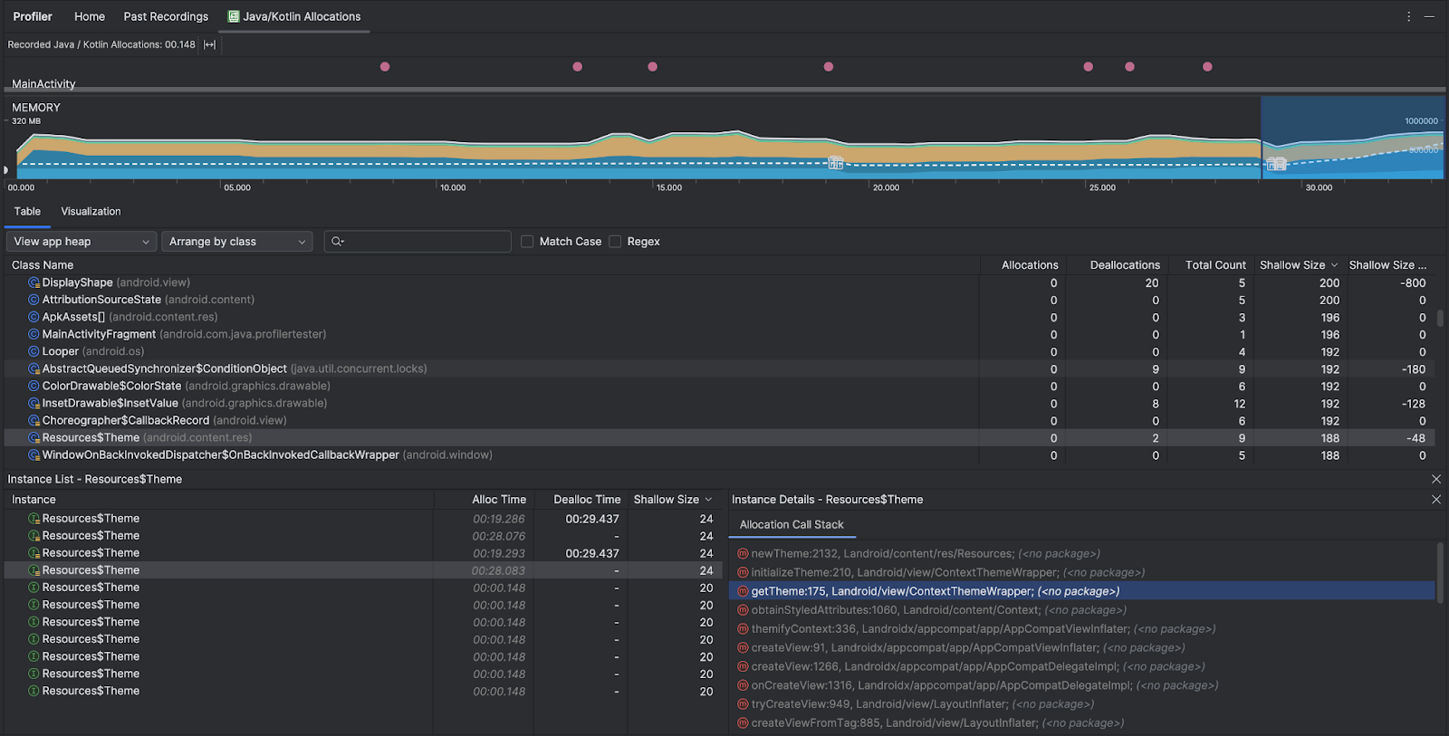 জাভা/কোটলিন বরাদ্দ রেকর্ড করা আপনাকে অবাঞ্ছিত মেমরি প্যাটার্ন সনাক্ত করতে সাহায্য করে যা কর্মক্ষমতা সমস্যা সৃষ্টি করতে পারে। প্রোফাইলার আপনাকে বস্তু বরাদ্দ সম্পর্কে নিম্নলিখিত দেখাতে পারে: