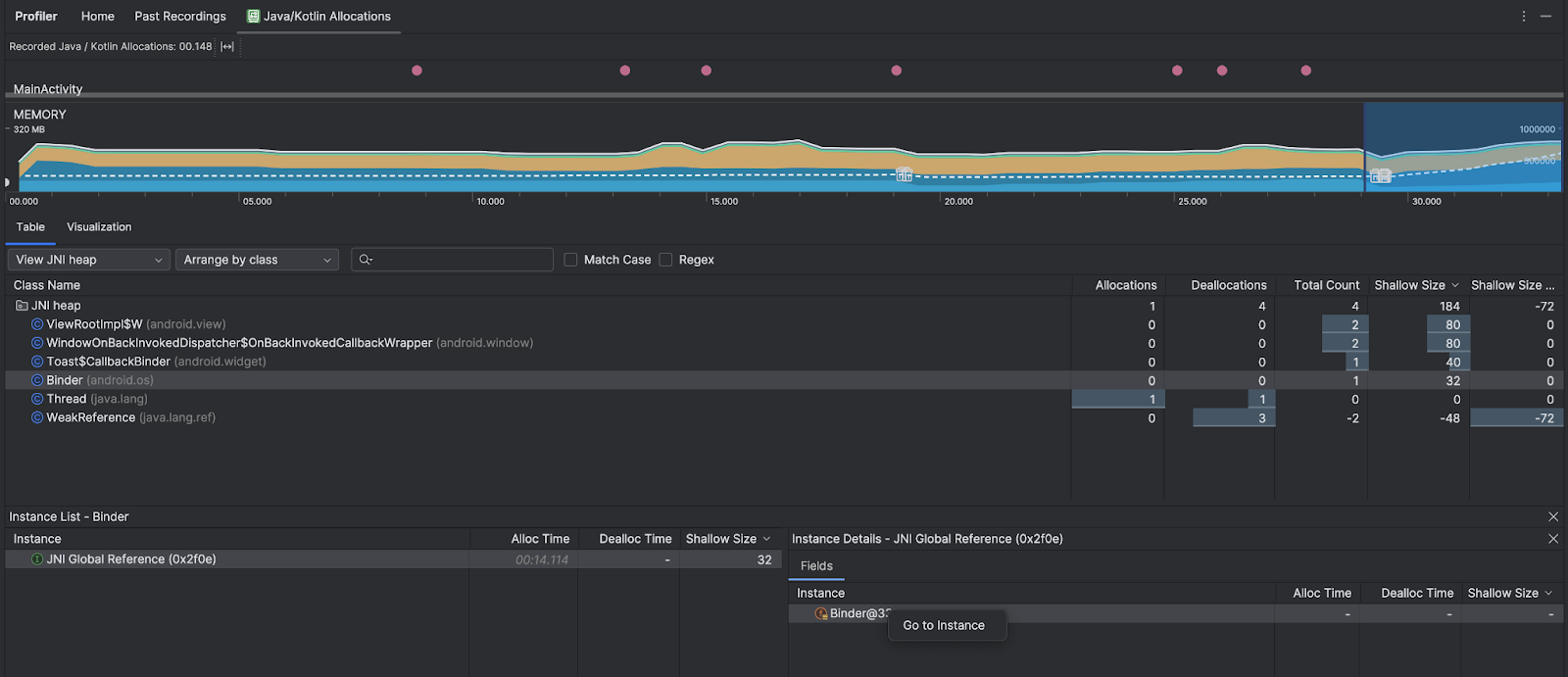 Aby rozwiązać takie problemy, w profilerze wybierz View JNI heap (Wyświetl stertę JNI), aby przejrzeć wszystkie globalne odwołania JNI i odfiltrować je według typów Java i natywnych stosów wywołań. Kliknij prawym przyciskiem myszy pole instancji na karcie Pola i wybierz Przejdź do instancji, aby wyświetlić odpowiedni stos wywołań alokacji.