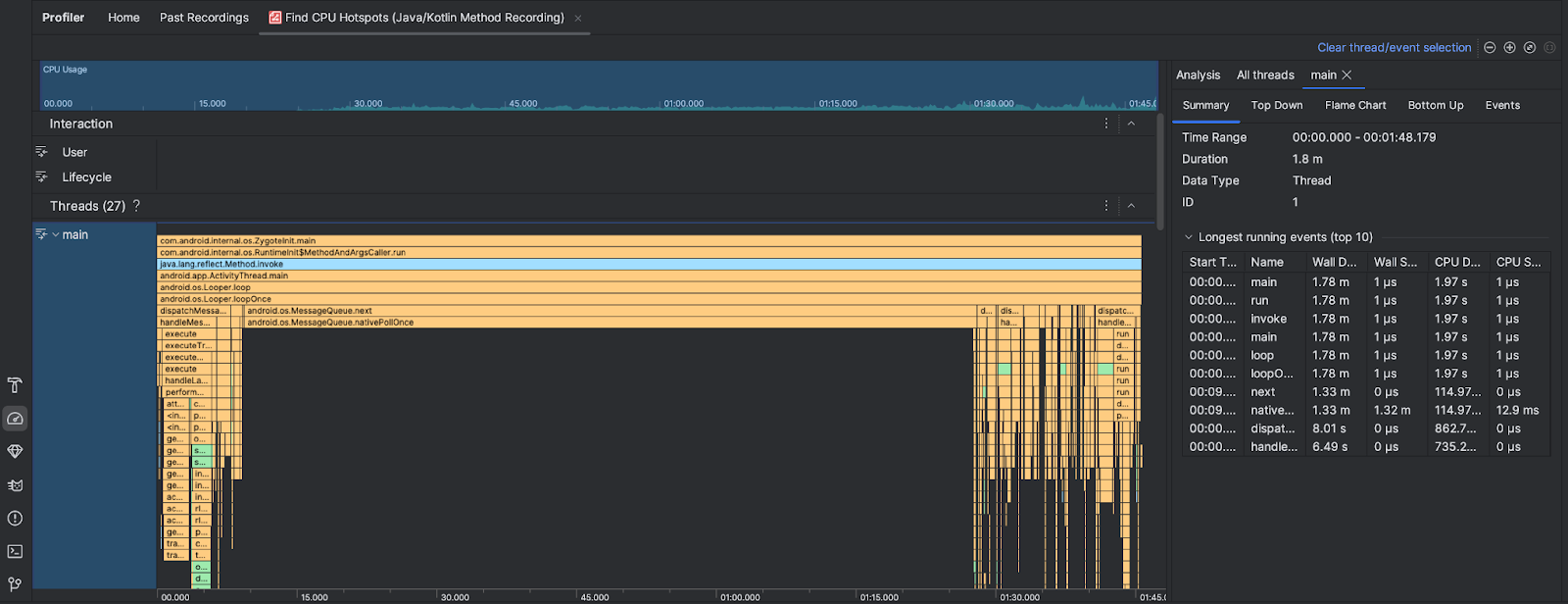 بعد تنفيذ مهمة العثور على نقاط ساخنة لوحدة المعالجة المركزية، يقدّم Android Studio Profiler المعلومات التالية: