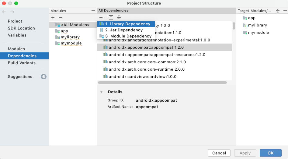 您可以使用 Project Structure 对话框向项目中添加依赖项。以下部分介绍了如何使用该对话框添加依赖项。