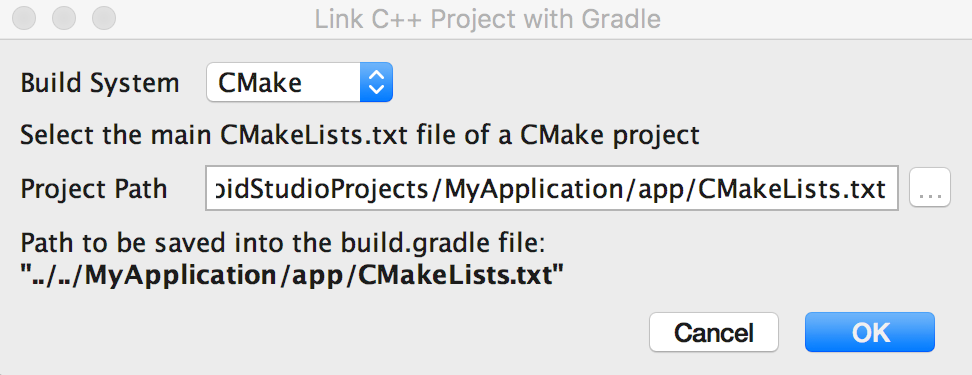 Figura 4. Vincular um projeto C++ externo usando a caixa de diálogo do Android Studio.