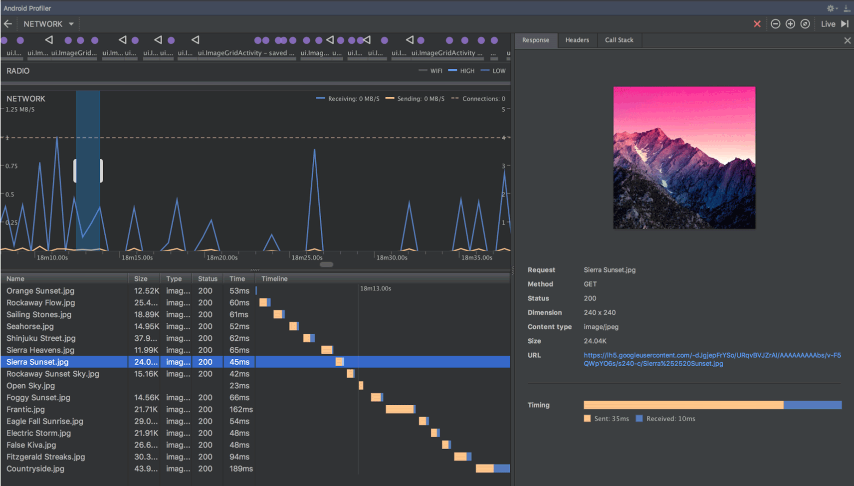 Сетевой профилировщик позволяет отслеживать сетевую активность вашего приложения, проверять полезную нагрузку каждого сетевого запроса и ссылаться на код, сгенерировавший сетевой запрос.