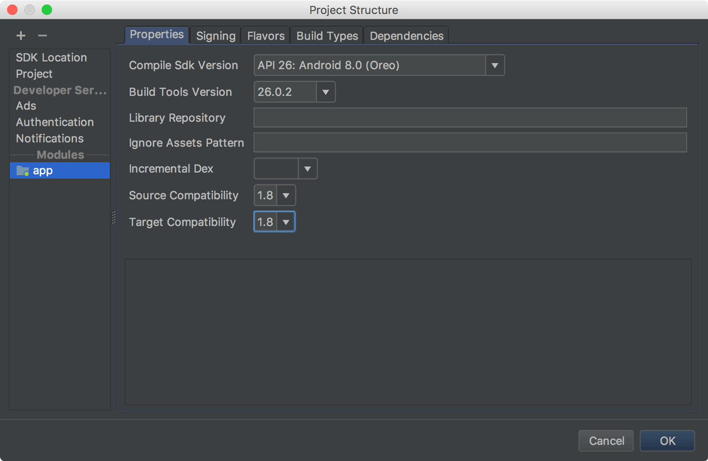 หากต้องการอัปเดตโปรเจ็กต์ให้รองรับเครื่องมือภาษา Java 8 ใหม่ ให้อัปเดตความเข้ากันได้ของแหล่งที่มาและความเข้ากันได้ของเป้าหมายเป็น 1.8 ในกล่องโต้ตอบโครงสร้างโปรเจ็กต์ (คลิกไฟล์ > โครงสร้างโปรเจ็กต์) ดูข้อมูลเพิ่มเติมได้ที่วิธี ใช้ฟีเจอร์ภาษาของ Java 8