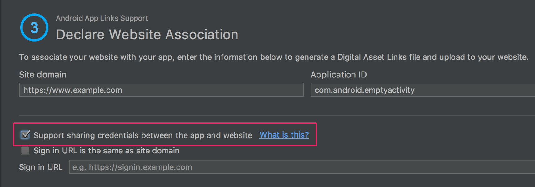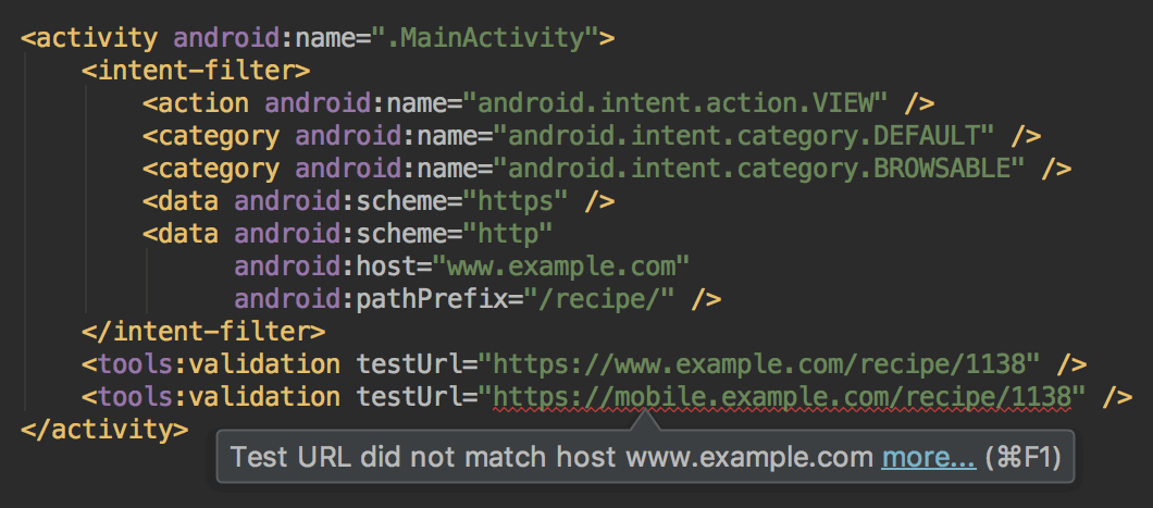 ตอนนี้ Android Studio รองรับแท็กพิเศษในไฟล์ Manifest ซึ่งช่วยให้คุณทดสอบ URL ของตัวกรอง Intent ได้แล้ว โดยแท็กเหล่านี้เป็นแท็กเดียวกับที่ผู้ช่วยลิงก์แอป สร้างให้คุณได้