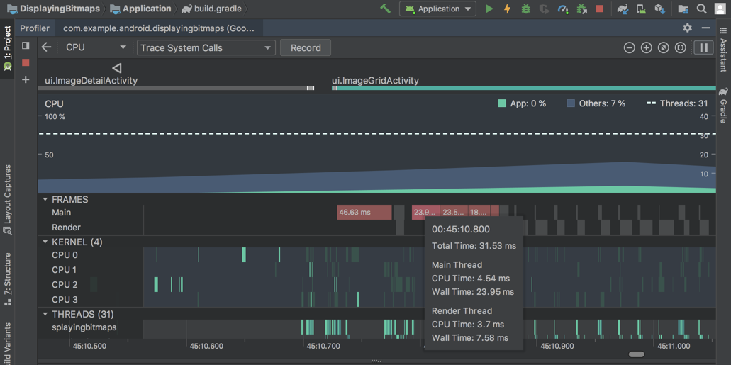 CPU Profiler- এ, আপনি এখন আপনার জাভা অ্যাপের মূল UI থ্রেড এবং RenderThread-এর প্রতিটি ফ্রেম রেন্ডার করতে কত সময় লাগে তা পরীক্ষা করতে পারবেন। UI জ্যাঙ্ক এবং কম ফ্রেমরেটের কারণ হতে পারে এমন বাধাগুলি তদন্ত করার সময় এই ডেটা কার্যকর হতে পারে। উদাহরণস্বরূপ, মসৃণ ফ্রেমরেট বজায় রাখতে প্রয়োজনীয় 16ms-এর চেয়ে বেশি সময় নেয় এমন প্রতিটি ফ্রেম লাল রঙে প্রদর্শিত হয়।