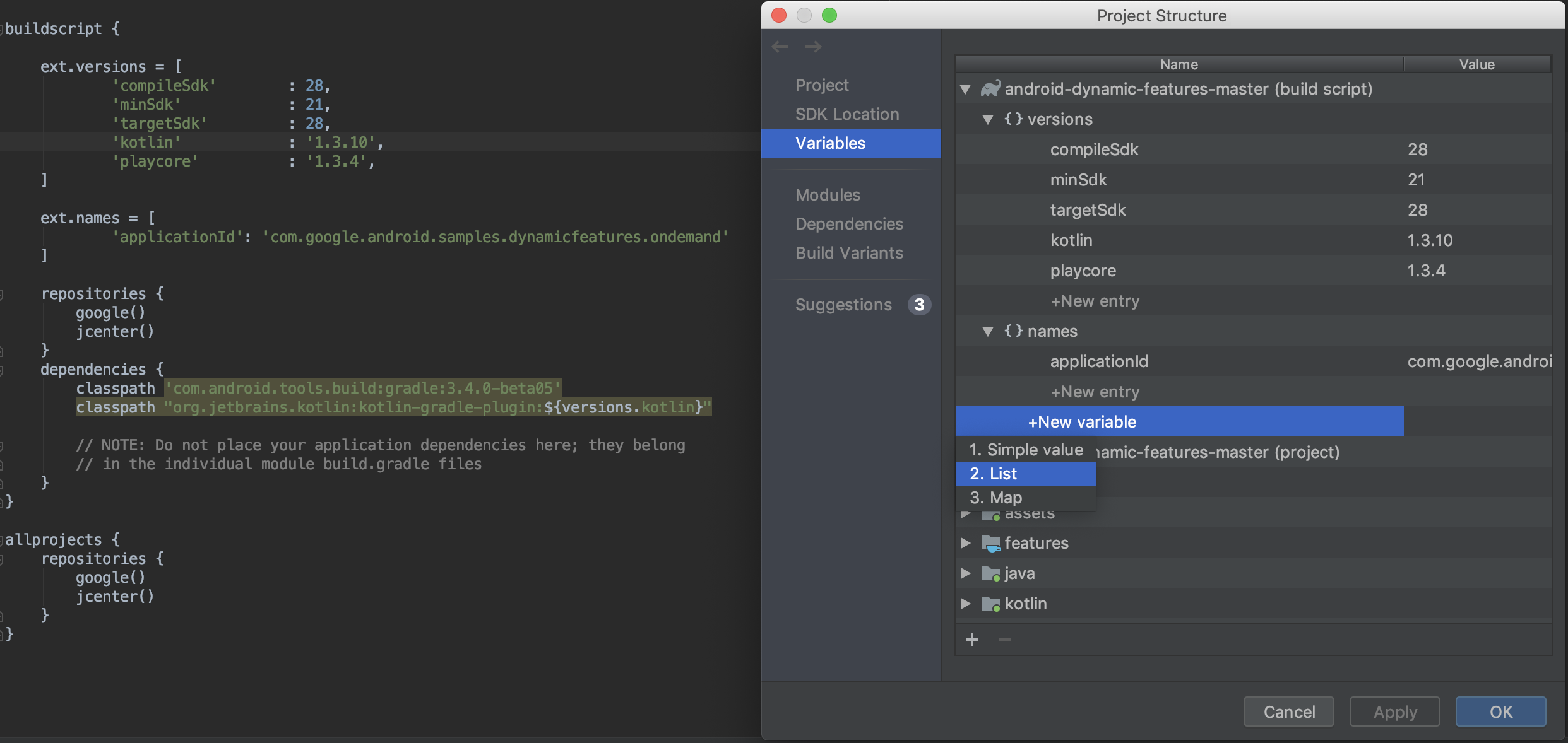 La nouvelle section "Variables" de la boîte de dialogue "Structure du projet" vous permet de créer et de gérer des variables de compilation, telles que celles permettant de garantir la cohérence des numéros de version des dépendances dans votre projet.