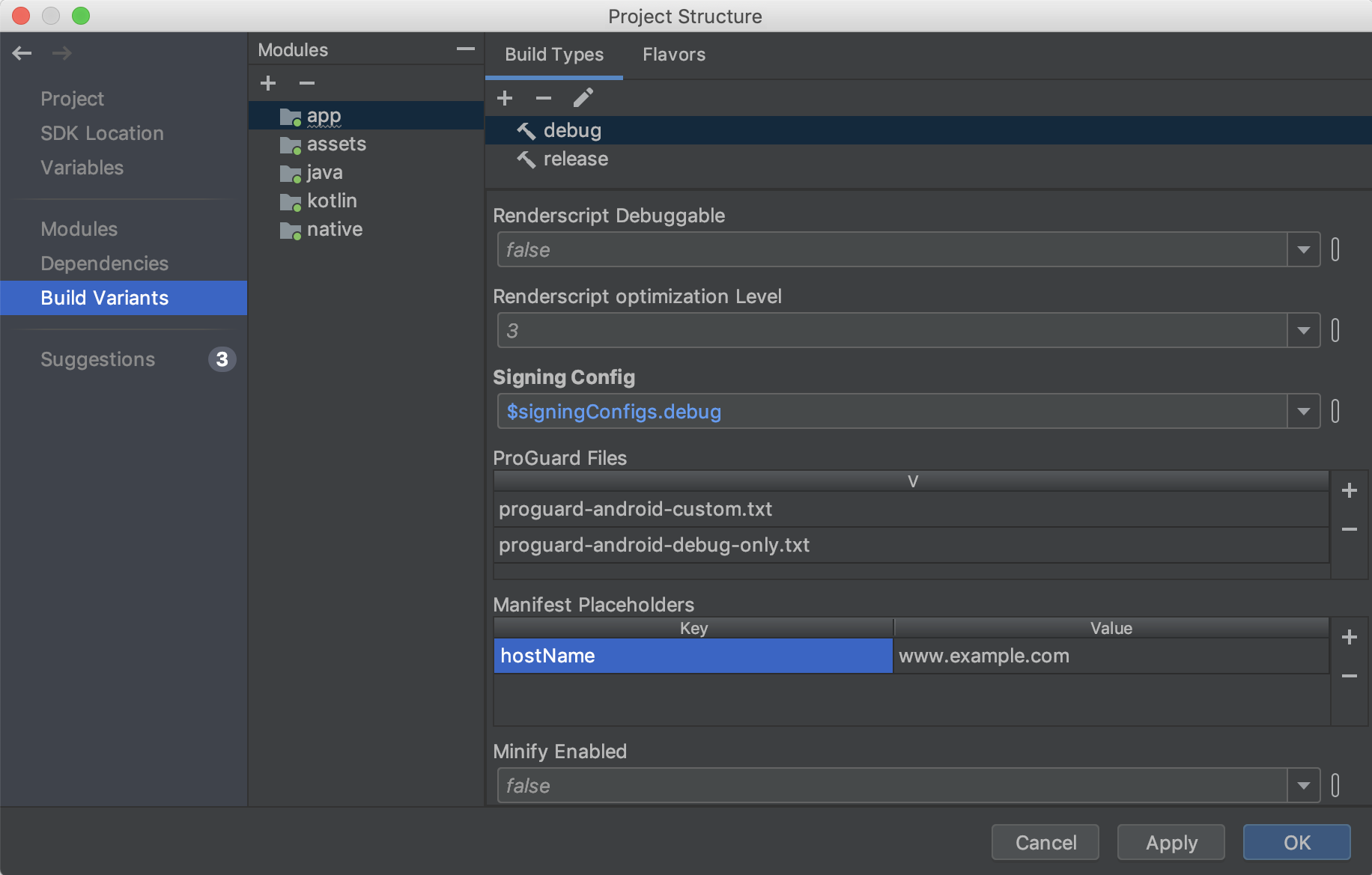 PSD의 이 섹션에서는 프로젝트의 각 모듈에 사용할 빌드 변형과 제품 버전을 만들고 구성합니다. 매니페스트 자리표시자와 ProGuard 파일을 추가하고 서명 키를 할당하는 등의 작업을 할 수 있습니다.
