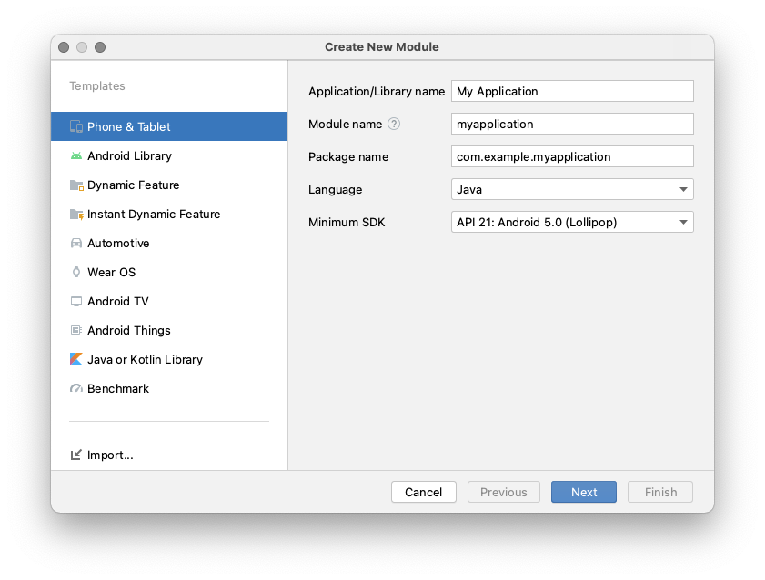 New Module 마법사에서 Import .JAR/.AAR Package 옵션도 삭제되었습니다. JAR이나 AAR을 프로젝트로 가져오려면 대신 Project Structure 대화상자를 사용하세요.