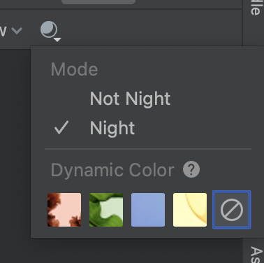 Đối với Android XML: Nếu bạn đã bật màu động trong ứng dụng, thì giờ đây bạn có thể sử dụng bộ chọn System UI Mode (Chế độ giao diện người dùng hệ thống) mới trên thanh công cụ để chuyển đổi hình nền và xem cách bố cục phản ứng với hình nền mà những người dùng khác đã chọn. Xin lưu ý rằng trước tiên, bạn phải chọn thay đổi chủ đề thành chủ đề màu sắc động Material, sau đó thay đổi hình nền.