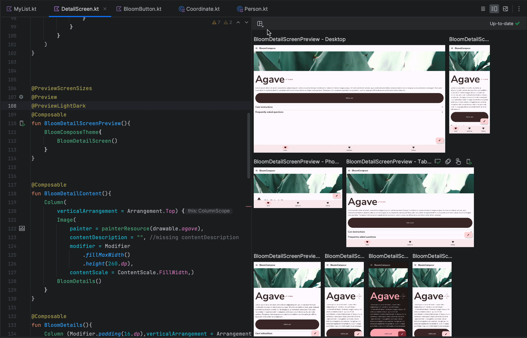 androidx.compose.ui:ui-tooling-preview 1.6.0-alpha01+ 導入了全新的 Multipreview API 範本:@PreviewScreenSizes、@PreviewFontScales、@PreviewLightDark,以及 @PreviewDynamicColors,因此您只要使用單一註解,即可在常見情境中預覽 Compose UI。