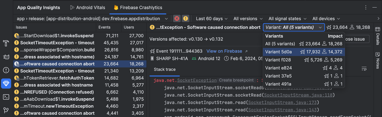 Wyświetlanie wariantów awarii Crashlytics w Statystykach jakości aplikacji