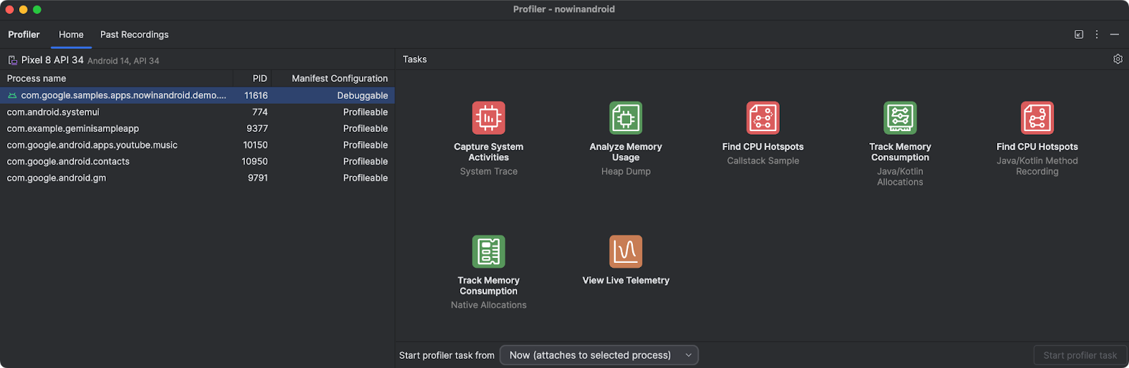 Обновленный дизайн Profiler, ориентированный на задачи, также упрощает запуск интересующей вас задачи, будь то профилирование процессора, памяти или энергопотребления вашего приложения. Например, вы можете запустить задачу трассировки системы для профилирования и улучшения времени запуска вашего приложения прямо из пользовательского интерфейса, как только вы откроете профилировщик.