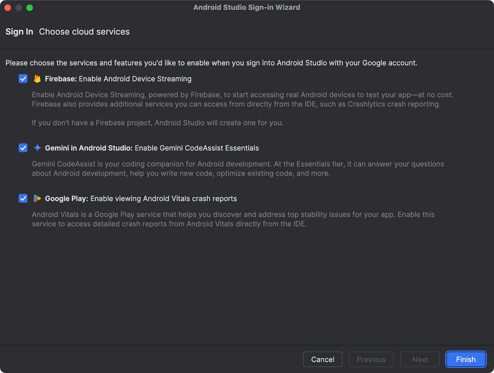 Tek bir kimlik doğrulama adımıyla birden fazla Google hizmetinde oturum açmak artık daha kolay. Android Studio'da Gemini'yi, Android cihaz aktarımı için Firebase'i, Android Vitals raporları için Google Play'i veya bu faydalı hizmetlerin tümünü kullanmak istiyorsanız yeni oturum açma akışı, bu hizmetleri kullanmaya başlamanızı kolaylaştırır. Firebase'i kullanmaya yeni başladıysanız ve Android Cihaz Akışı'nı kullanmak istiyorsanız Android Studio sizin için otomatik olarak bir proje oluşturur. Böylece, gerçek bir fiziksel Firebase cihazını hızlıca yayınlamaya başlayabilirsiniz. Ayrıntılı izin kapsamı sayesinde, hangi hizmetlerin hesabınıza erişebileceğini her zaman kontrol edebilirsiniz. Başlamak için profil avatarını tıklayın ve geliştirici hesabınızla oturum açın.