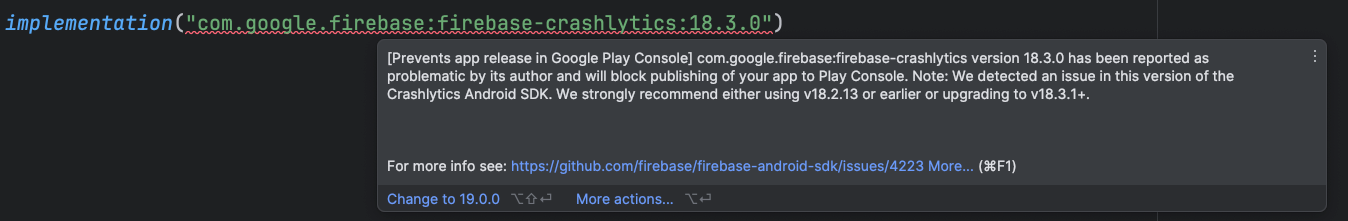 また、Android Studio では、SDK 作成者からのメモがエディタに直接表示されるようになり、時間を節約できます。推奨バージョンまたはバージョン範囲が利用可能な場合、Android Studio にはクイック修正も含まれます。