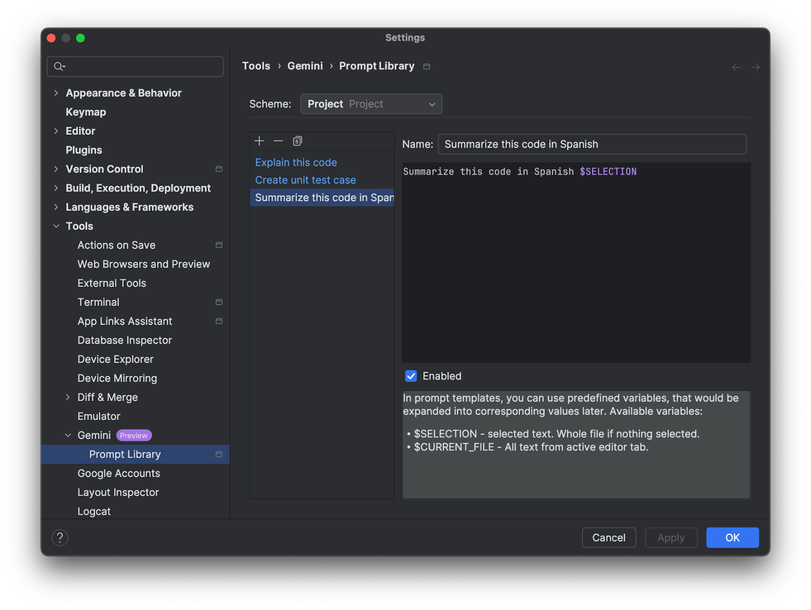 Gemini nella nuova funzionalità Libreria dei prompt di Android Studio migliora la produttività consentendoti di salvare e gestire i prompt utilizzati di frequente. Accedi alla Libreria dei prompt da Impostazioni > Gemini > Libreria dei prompt per archiviare e recuperare i prompt. Puoi archiviare i prompt a livello di IDE o di progetto: