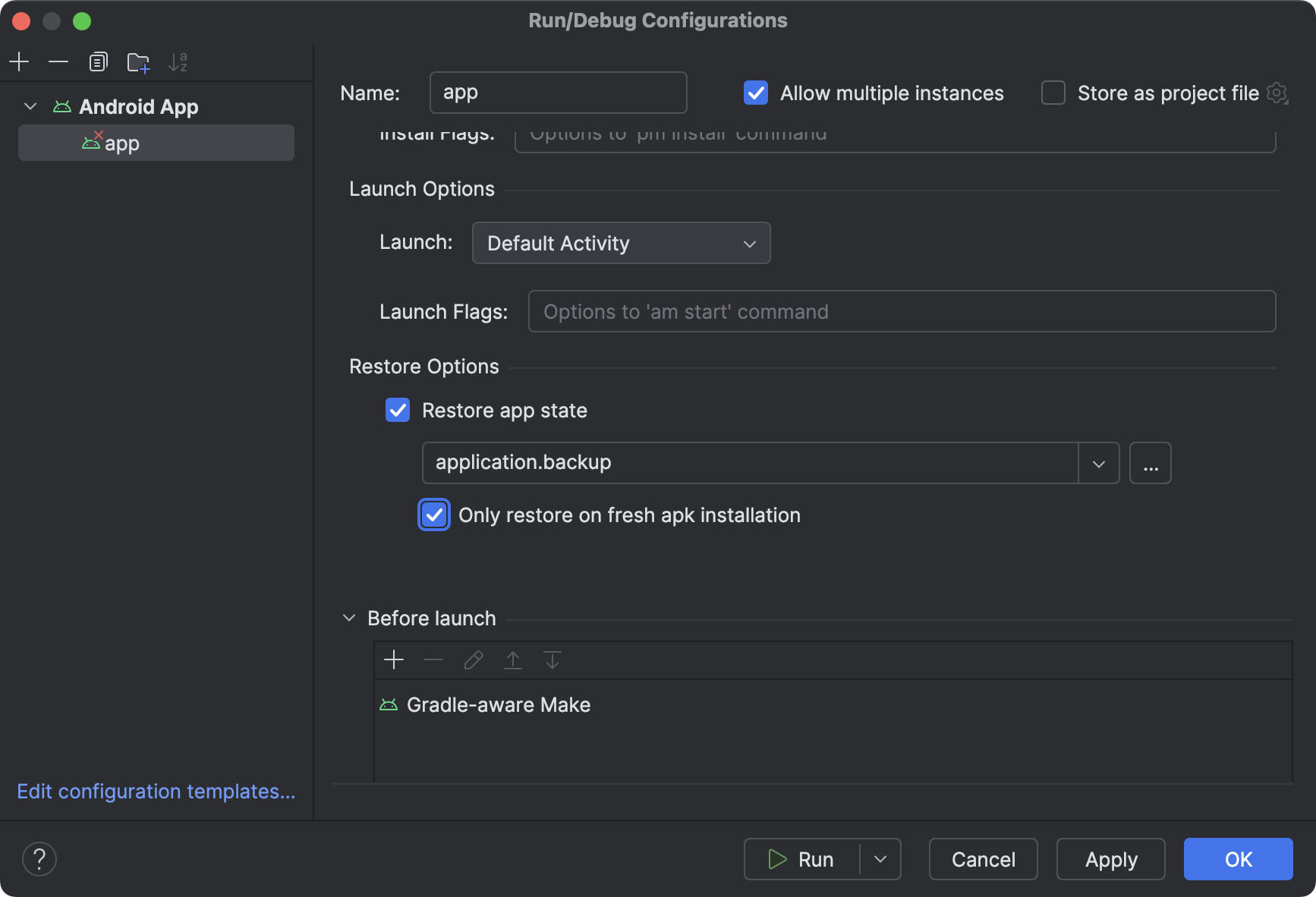 - Si vous souhaitez uniquement restaurer les données d'application lors d'une nouvelle installation, cochez la case Restaurer uniquement lors d'une nouvelle installation de l'APK. Cette option peut être utile si vous déployez l'application sur un nouvel appareil de test et que vous souhaitez restaurer des données pour faciliter le débogage et le développement de l'application.