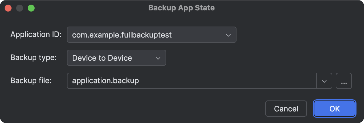 Android Studio Narwhal 3 Feature Drop מספק דרכים ליצור גיבוי לאפליקציה ולשחזר אותה במכשיר אחר. האפשרות הזו יכולה להיות שימושית לבדיקה של התנהגות האפליקציה כשמשחזרים נתונים של אפליקציה ממכשיר למכשיר או מגיבוי בענן, או אם רוצים דרך מהירה יותר להגדיר מכשיר בדיקה עם הנתונים שדרושים לפיתוח ולניפוי באגים באפליקציה.