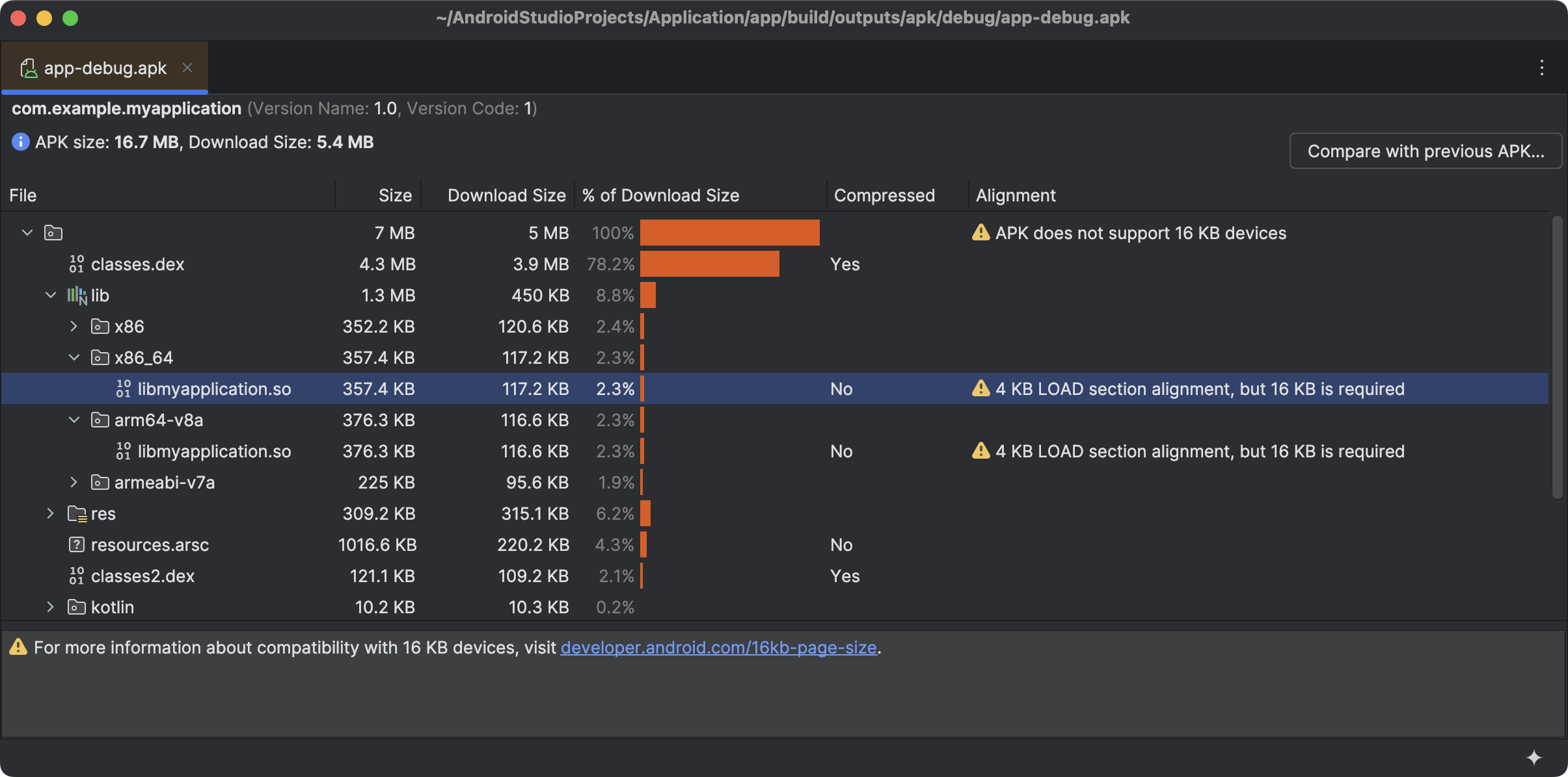 Android Studio Narwhal Feature Drop adds improved support for transitioning to 16 KB page sizes. To help you navigate this transition smoothly, Android Studio now offers proactive warnings when building APKs or Android App Bundles that are incompatible with 16 KB devices. Using the APK Analyzer, you can also find out which libraries are incompatible with 16 KB devices. To test your apps in this new environment, a dedicated 16 KB emulator target is also available in Android Studio alongside existing 4 KB images.