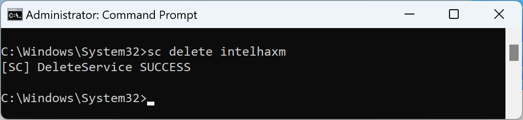 احذف خدمة Intel HAXM من خلال تنفيذ الأمر "sc delete intelhaxm". من المفترض أن تظهر لك النتيجة التالية.