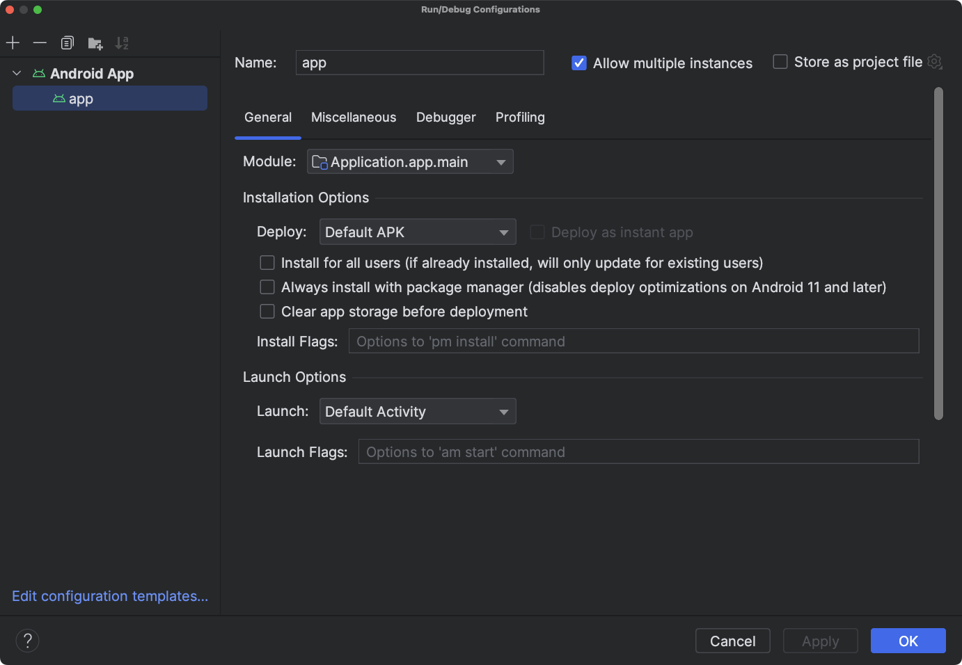 您可以在「Miscellaneous」分頁中指定 logcat、安裝、啟動和部署選項。「General」分頁也包含安裝選項。