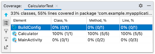 The test coverage tool is available for local unit tests to track the percentage and areas of your app code that your unit tests have covered. Use the test coverage tool to determine whether you have adequately tested the elements, classes, methods, and lines of code that make up your app.