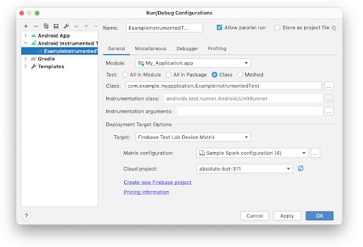 Figure 8. Creating a test configuration for Firebase Test Lab.
