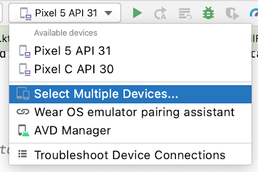 Before running your tests, open the target device drop-down menu, and select Select Multiple Devices….