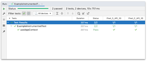 Your instrumented tests will run on a physical device or emulator. To learn more about setting up physical devices, see Run apps on a hardware device. To learn more about setting up emulators, see Run apps on the Android Emulator.