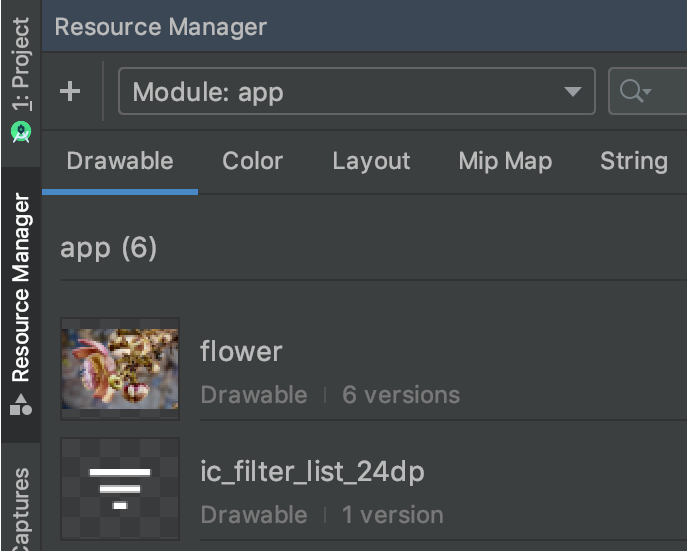 Resource Manager adalah jendela alat untuk mengimpor, membuat, mengelola, dan menggunakan resource di aplikasi Anda. Untuk membuka jendela alat, pilih View > Tool Windows > Resource Manager dari menu atau pilih Resource Manager di panel sisi kiri.