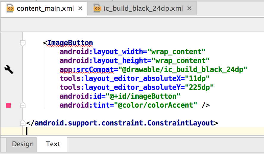 <ImageButton android:layout_width="wrap_content" android:layout_height="wrap_content" app:srcCompat="@drawable/ic_build_black_24dp" tools:layout_editor_absoluteX="11dp" tools:layout_editor_absoluteY="225dp" android:id="@+id/imageButton" android:tint="@color/colorAccent" />