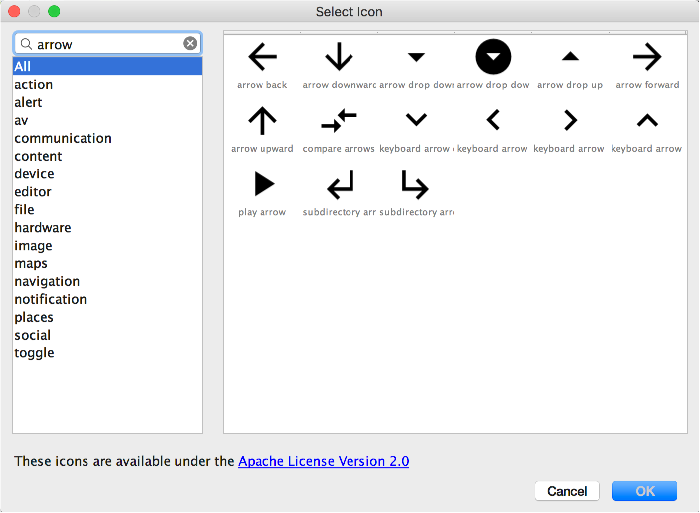 Google 質感設計規格具備多種質感設計圖示,供您在 Android 應用程式中運用。Vector Asset Studio 能協助您挑選及匯入質感設計圖示、設定圖示的大小,並且定義不透明度和從右到左 (RTL) 的鏡像設定。