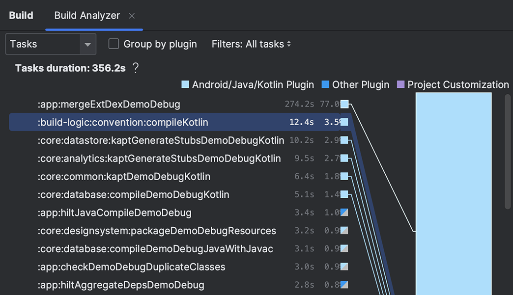 Dengan teknologi Gradle, sistem build Android Studio memungkinkan Anda menyesuaikan build Anda dalam menghasilkan berbagai varian build untuk perangkat Android yang berbeda dari satu project. Kemudian, analisis performa build dan pahami tempat potensi masalah build dalam project Anda dengan Build Analyzer.