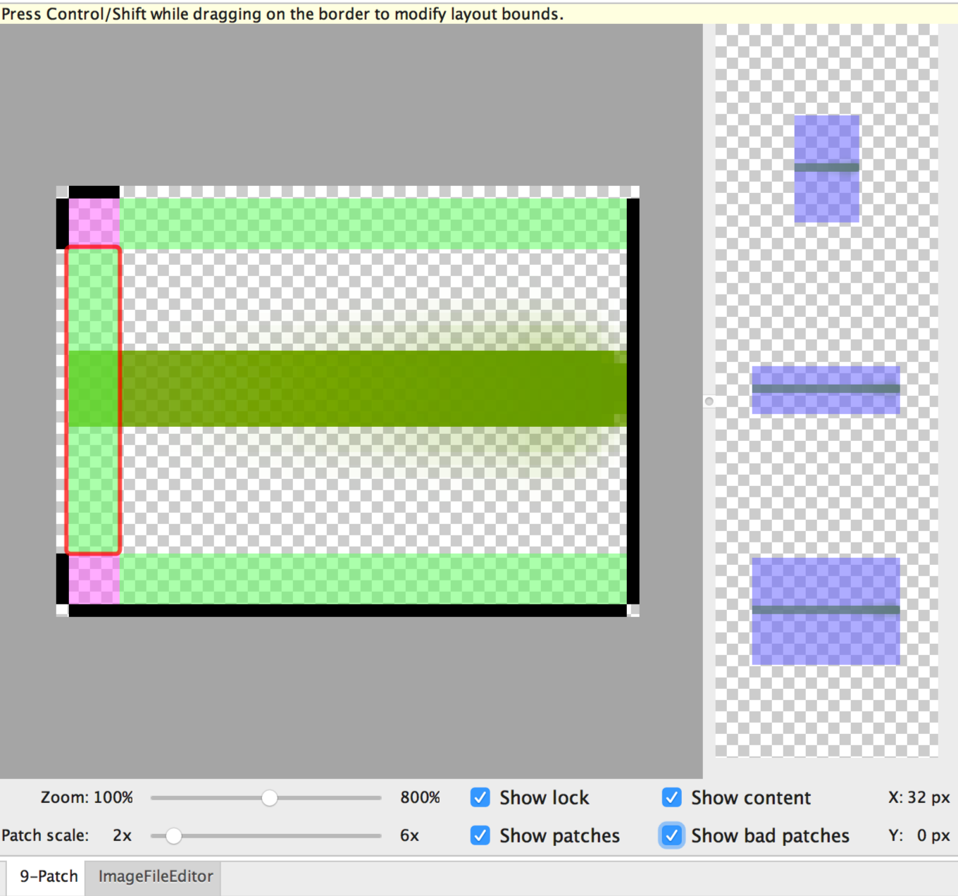 图 2. Android Studio 中的 NinePatch 图像,显示了内容、图块和不良图块。