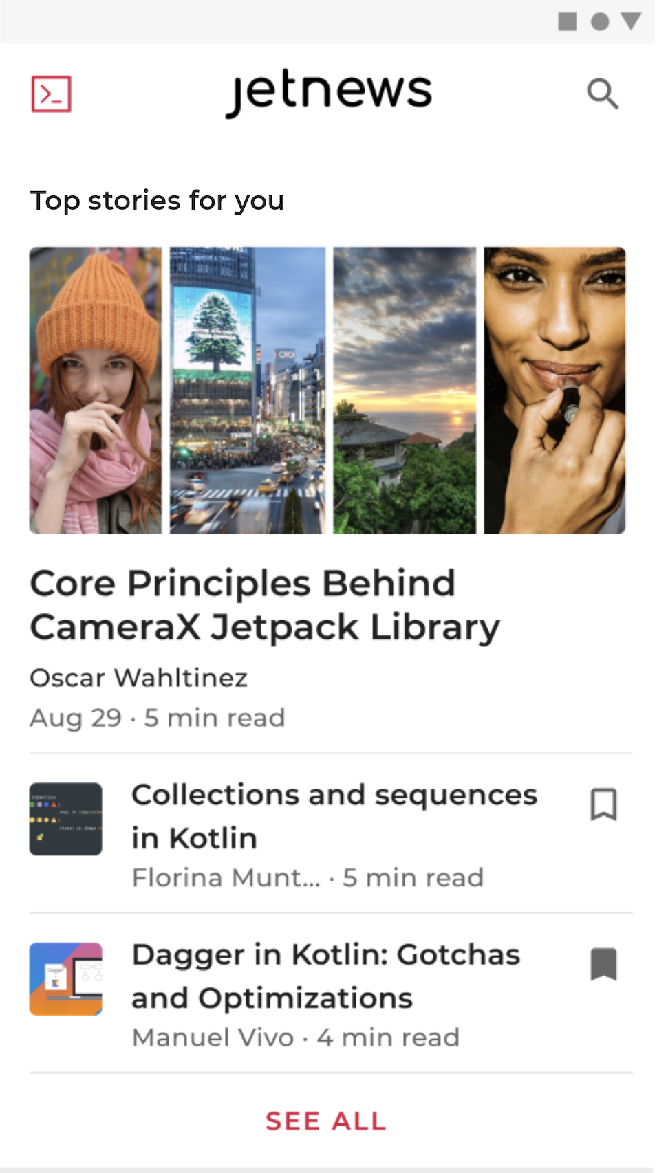如為導航目的地或畫面,ViewModel 可與存放區或用途類別搭配使用,藉此取得資料並轉換為 UI 狀態,同時整合可能會造成狀態異動的事件效果。前述的個案研究包含報導清單,每個報導都有一個標題、說明、來源、作者姓名、發布日期,以及是否已經加入書籤。每個報導項目的 UI 外觀看起來會是這樣: