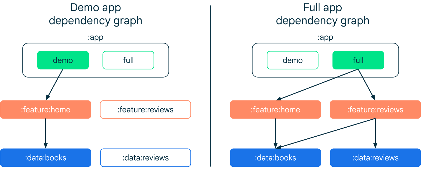 ऐप्लिकेशन मॉड्यूल, ऐप्लिकेशन में एंट्री करने का पॉइंट होते हैं. ये सुविधा मॉड्यूल पर निर्भर होते हैं और आम तौर पर, रूट नेविगेशन की सुविधा देते हैं. बिल्ड वैरिएंट की मदद से, किसी एक ऐप्लिकेशन मॉड्यूल को कई अलग-अलग बाइनरी में कंपाइल किया जा सकता है.