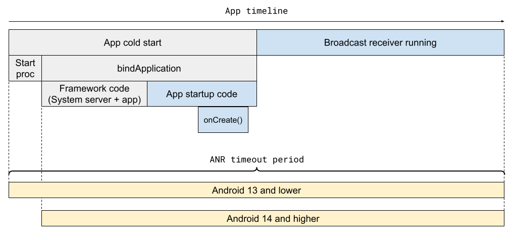 广播时长测算从 system_server 调度到应用后开始,到应用处理完广播后结束。如果应用进程尚未运行,则还需要在 ANR 超时期限内执行冷启动。因此,应用启动缓慢可能会导致广播接收器 ANR。