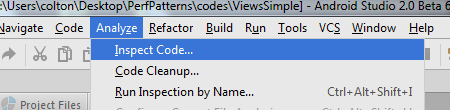 הכלי Lint של Android Studio יכול לעזור לכם לקבל מושג חוסר היעילות בהיררכיית התצוגות. כדי להשתמש בכלי הזה, בוחרים באפשרות ניתוח > בדיקת הקוד, כפי שמוצגת באיור 1.