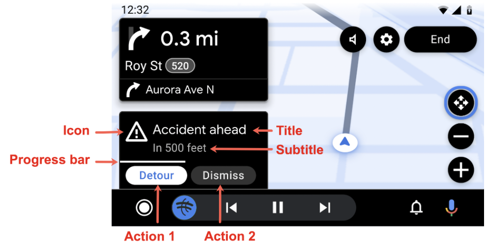 Alert แสดงข้อมูลสำคัญแก่ผู้ขับขี่พร้อมด้วยการดำเนินการที่ไม่บังคับโดยไม่ต้องออกจากบริบทของหน้าจอการนําทาง Alert จะทำงานภายใน NavigationTemplate เพื่อหลีกเลี่ยงการบล็อกเส้นทางการนําทางและลดสิ่งรบกวนไม่ให้ผู้ขับขี่เสียสมาธิ เพื่อให้ผู้ขับขี่ได้รับประสบการณ์การใช้งานที่ดีที่สุด