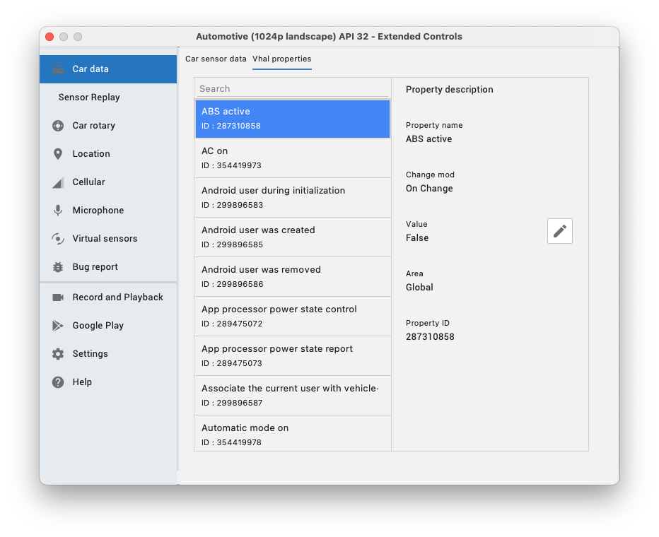 در حالی که شبیهساز در حال اجرا است، میتوانید مقادیر این ویژگیها را از ویژگی Car data در کنترلهای توسعهیافته تغییر دهید. برای مثال، برای تنظیم سرعت فعلی وسیله نقلیه، میتوانید ویژگی مربوط به سرعت ( VehiclePropertyIds.PERF_VEHICLE_SPEED ) را پیدا کرده و مقدار آن را تغییر دهید.