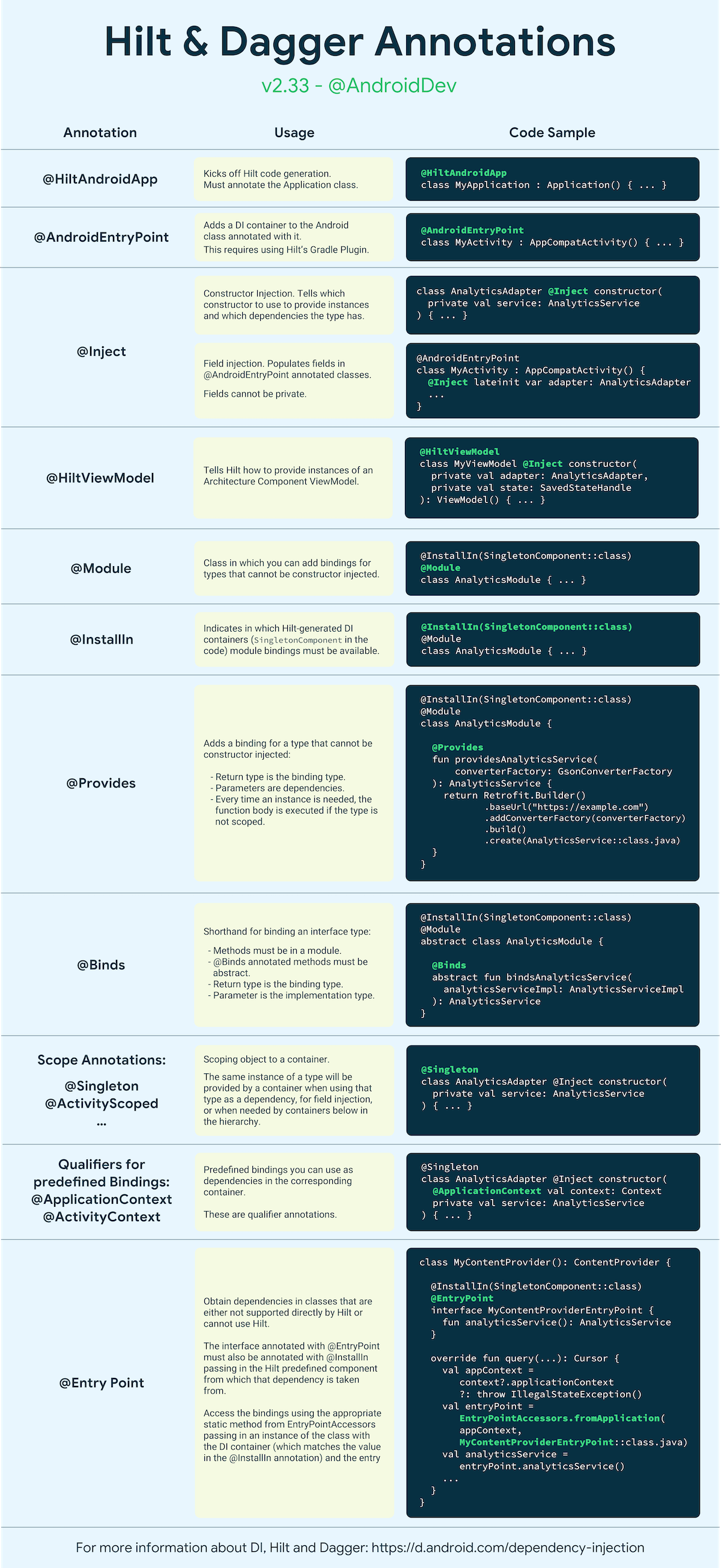 通过此备忘单,您可以快速了解不同 Hilt 和 Dagger 注解的功能及其使用方法。备忘单也有可以下载的 PDF 格式版本。