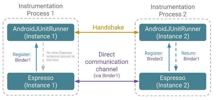 3. 两个 AndroidJUnitRunner 实例执行握手,以在彼此之间建立连接。同时,每个 AndroidJUnitRunner 实例都将所有已注册的客户端(如 Espresso)与它们各自在其他进程中的对应客户端连接起来,以便这些客户端在它们之间形成直接的通信信道。