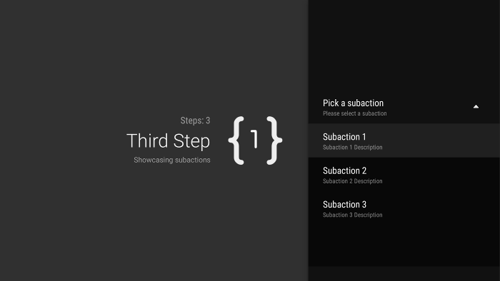 يمثّل النوع GuidedStepSupportFragment خطوة واحدة في سلسلة من الخطوات. من الناحية المرئية، يوفّر عرضًا إرشاديًا يتضمّن قائمة بالإجراءات أو القرارات المحتملة للخطوة.