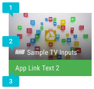 • 对于徽章图标 (COLUMN_APP_LINK_ICON_URI)、 系统使用一个显示应用名称的标志。如果系统也使用 应用横幅或海报图片的默认应用图片,未显示应用标志。