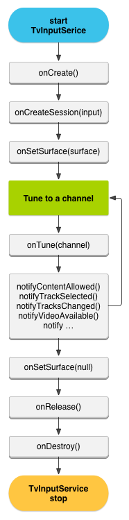 TvInputService.Session ব্যবহারকারী একটি চ্যানেল নির্বাচন করলে onTune() ইভেন্ট পরিচালনা করে এবং বিষয়বস্তু এবং বিষয়বস্তু মেটাডেটা পরিবর্তনের জন্য সিস্টেম টিভি অ্যাপকে অবহিত করে। এই notify() পদ্ধতিগুলি এই প্রশিক্ষণে আরও কন্ট্রোল কন্টেন্ট এবং হ্যান্ডেল ট্র্যাক নির্বাচনের মধ্যে বর্ণনা করা হয়েছে।
