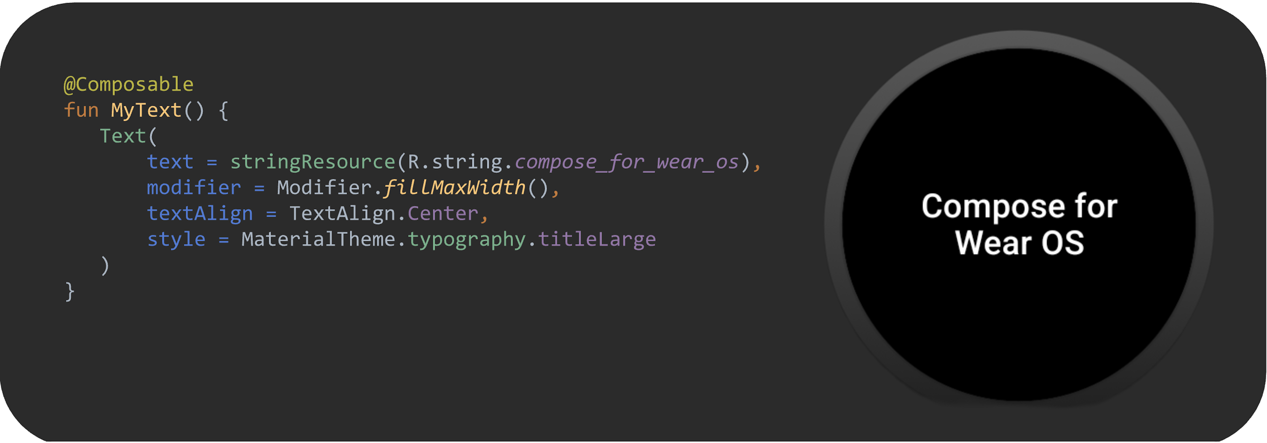Wear OS で Jetpack Compose を使用することは、他の Android プロジェクトで Jetpack Compose を使用することと似ています。主な違いは、Wear 向け Jetpack Compose では Wear 固有のライブラリが追加され、スマートウォッチ向けにカスタマイズしたユーザー インターフェースを簡単に作成できる点です。場合によっては、これらのコンポーネントが Wear 以外のコンポーネントと同じ名前を共有することもあります( androidx.wear.compose.material3.Buttonandroidx.compose.material3.Button