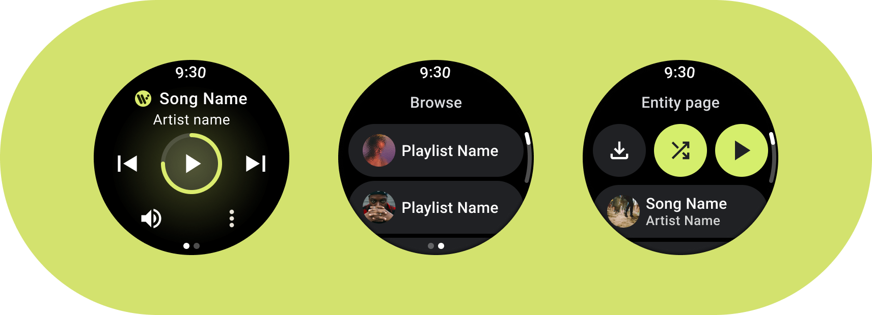 Erstellen Sie Medien-Apps, die die Designanforderungen von Wear OS erfüllen. Medien-Apps enthalten oft die Seiten Durchsuchen und Entität.